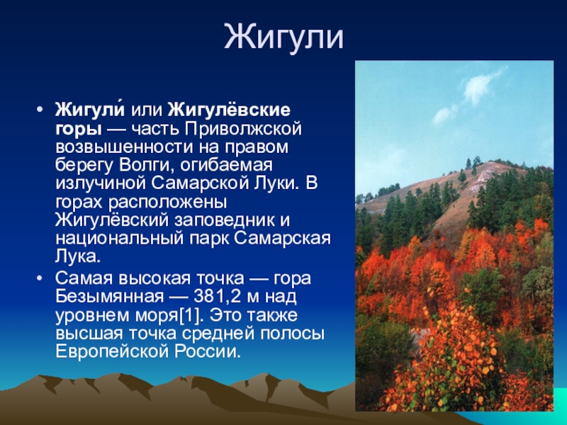огибаемая излучиной Самарской Луки. В горах расположены Жигулёвский заповедник и национальный парк Самарская Лука.