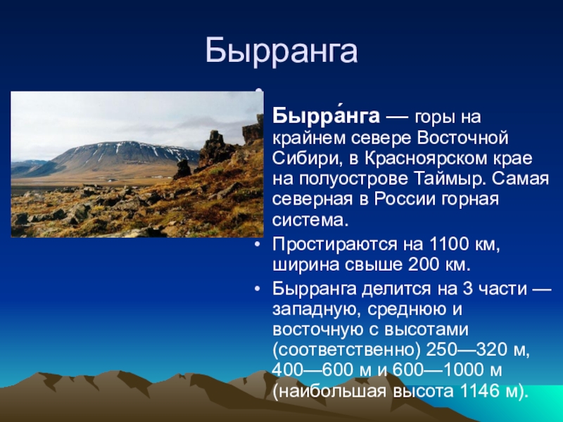 Бырра́нга — горы на крайнем севере Восточной Сибири, в Красноярском крае на полуострове Таймыр. Самая северная в России горная система.
