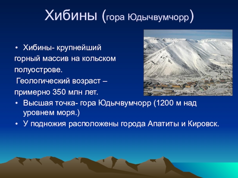 Высшая точка- гора Юдычвумчорр (1200 м над уровнем моря.)