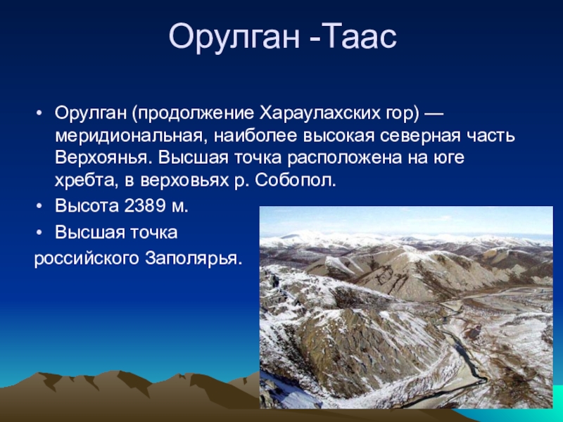 Орулган (продолжение Хараулахских гор) — меридиональная, наиболее высокая северная часть