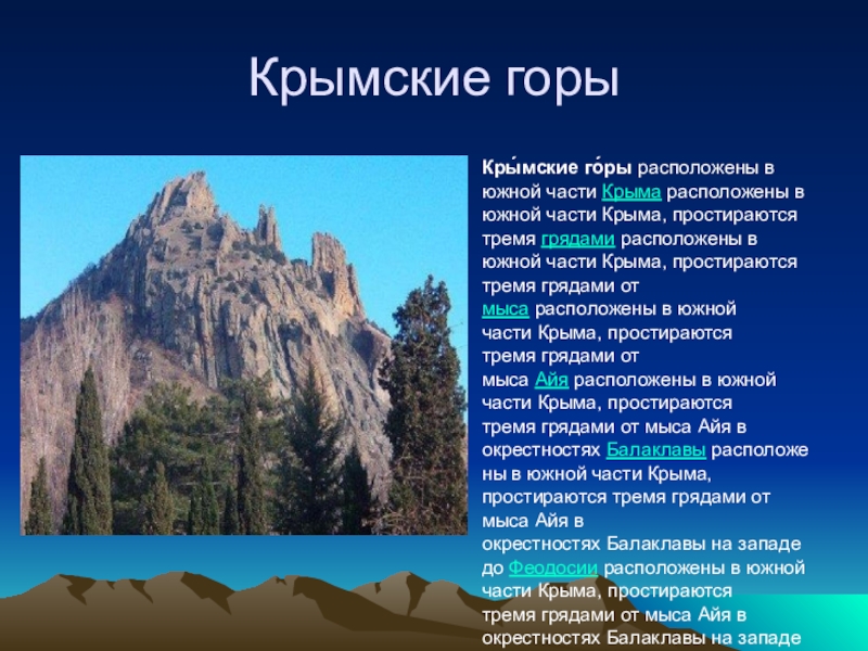 Кры́мские го́ры расположены в южной части Крыма расположены в южной части Крыма, простираются тремя грядами расположены