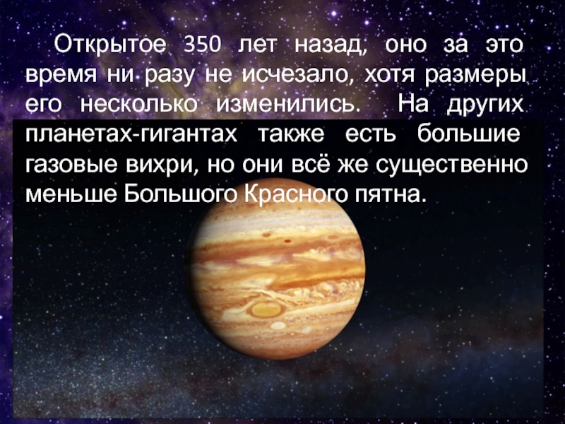 исчезало, хотя размеры его несколько изменились. На других планетах-гигантах также есть большие газовые вихри, но они всё же существенно меньше Большого Красного пятна.