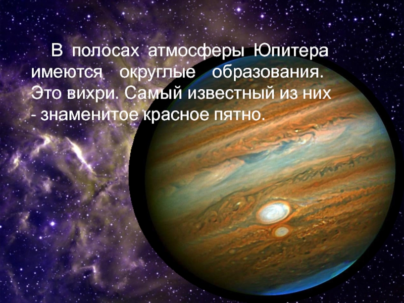 В полосах атмосферы Юпитера имеются округлые образования. Это вихри. Самый известный из них - знаменитое красное пятно.
