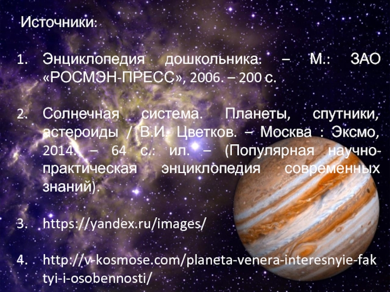Источники:Энциклопедия дошкольника. – М.: ЗАО «РОСМЭН-ПРЕСС», 2006. – 200 с.Солнечная система. Планеты, спутники, астероиды / В.И. Цветков.