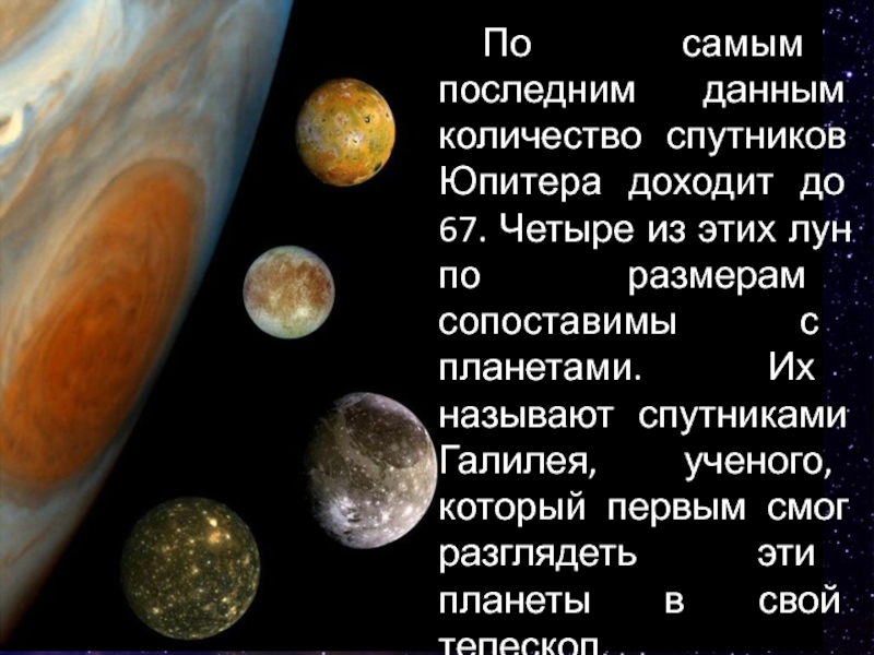 Слайд 4 По самым последним данным количество спутников Юпитера доходит до 67. Четыре