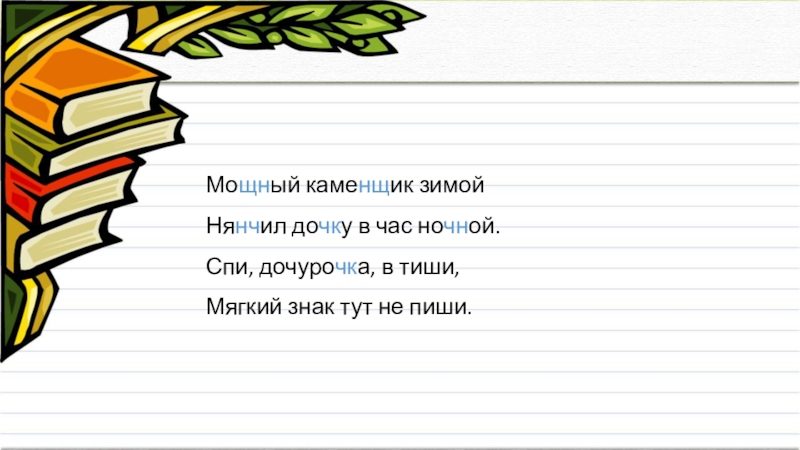 Мощный каменщик зимойНянчил дочку в час ночной.Спи, дочурочка, в тиши,Мягкий знак тут не пиши.