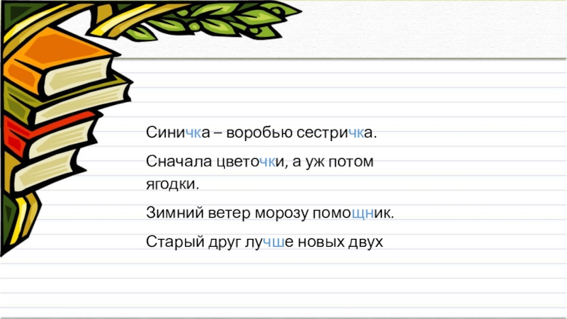 Синичка – воробью сестричка.Сначала цветочки, а уж потом ягодки.Зимний ветер морозу помощник.Старый друг лучше новых двух