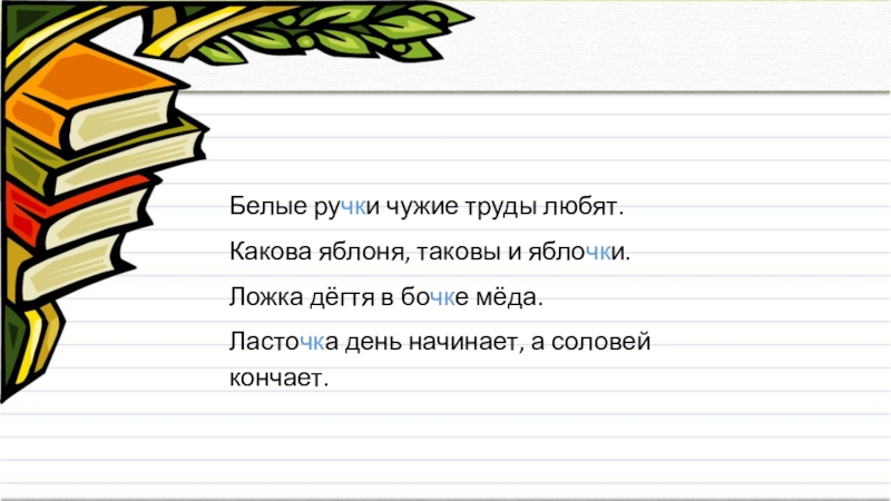Белые ручки чужие труды любят.Какова яблоня, таковы и яблочки.Ложка дёгтя в бочке мёда.Ласточка день начинает, а соловей