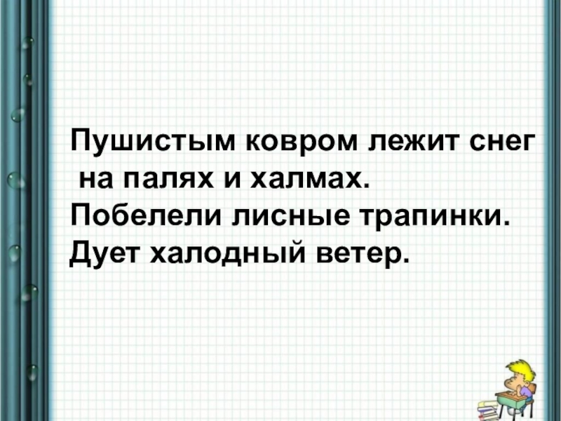 Пушистым ковром лежит снег на полях и холмах.Побелели лесные тропинки. Дует холодный ветер.