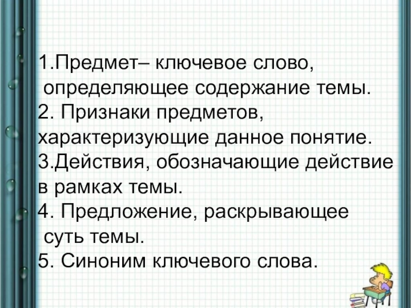 1.Предмет– ключевое слово, определяющее содержание темы.2. Признаки предметов, характеризующие данное понятие.3.Действия, обозначающие действие в рамках темы.4. Предложение,