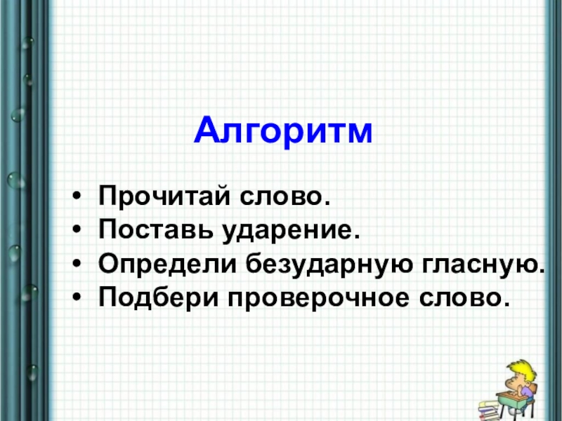 Алгоритм •  Прочитай слово. •  Поставь ударение. •  Определи безударную гласную.