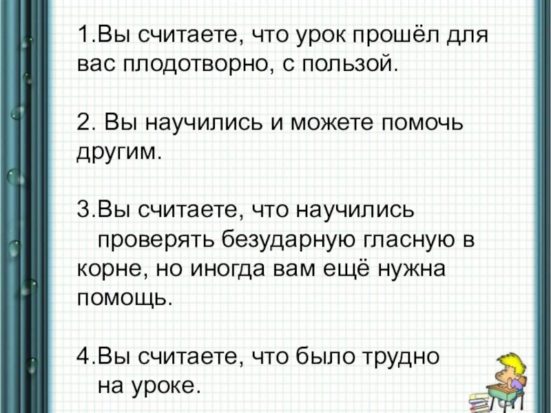 1.Вы считаете, что урок прошёл для     вас плодотворно, с пользой.2. Вы научились и