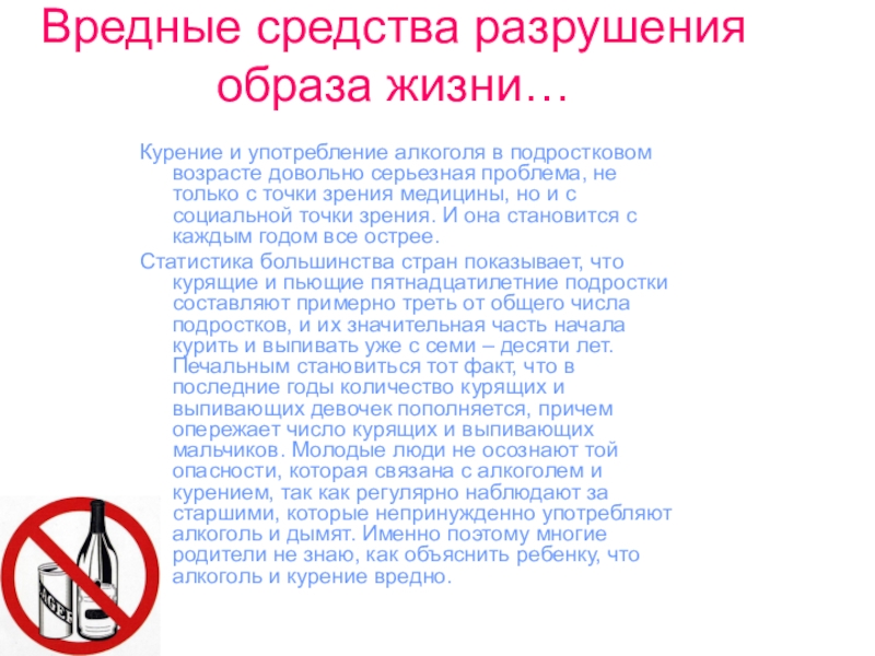 Вредные средства разрушения образа жизни…Курение и употребление алкоголя в подростковом возрасте довольно серьезная проблема, не только с