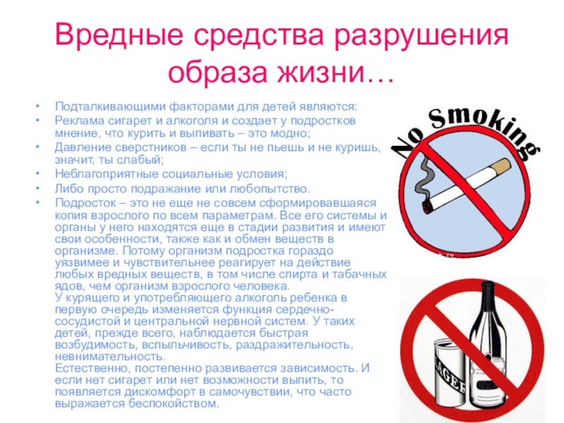 Вредные средства разрушения образа жизни…Подталкивающими факторами для детей являются:Реклама сигарет и алкоголя и создает у подростков мнение,