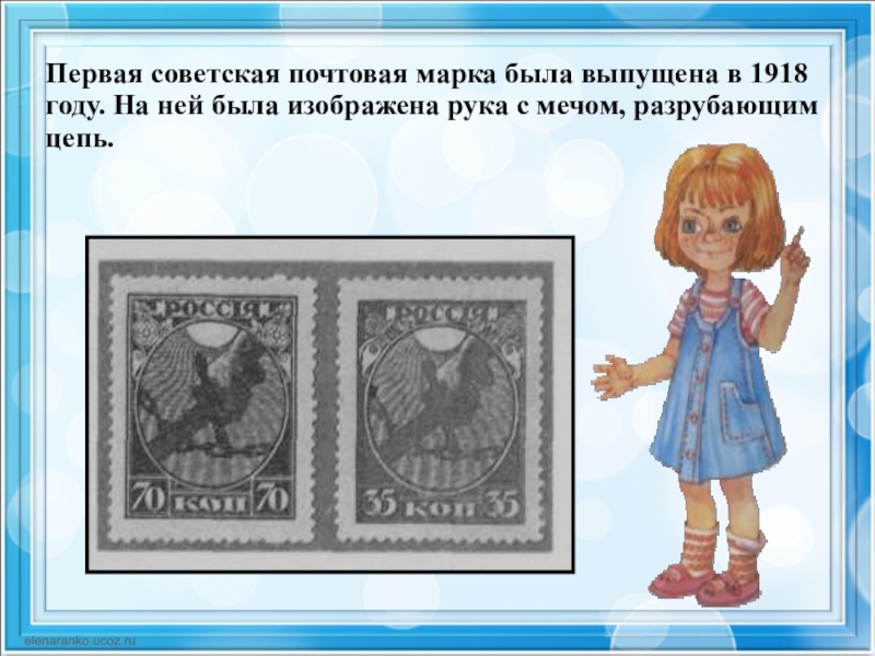 Первая советская почтовая марка была выпущена в 1918 году. На