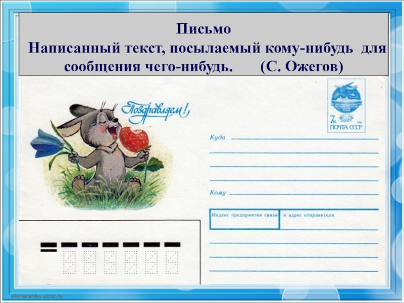Адресат – тот, которому предназначено письмо, т. е. получатель.