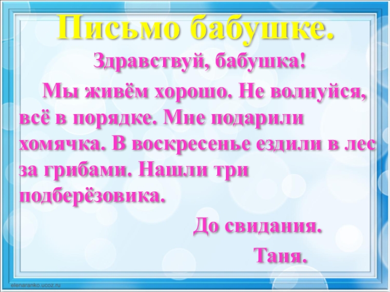 писала. Мы живём хорошо. Не волнуйся, всё в порядке. Мне подарили хомячка. В воскресенье ездили в лес за грибами. Нашли три подберёзовика. Передай привет тёте Клаве.