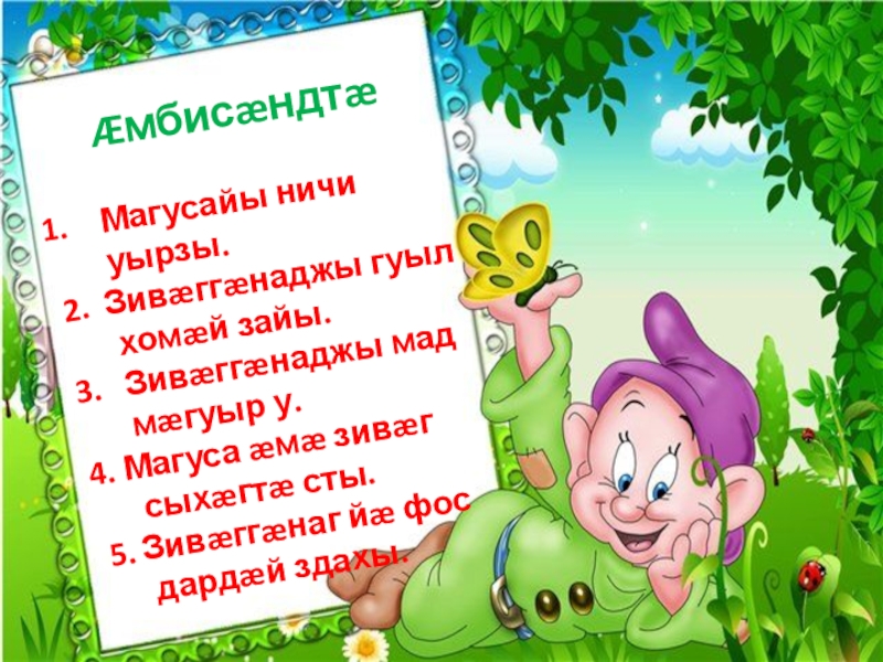 ÆмбисæндтæМагусайы ничи уырзы.2. Зивæггæнаджы гуыл хомæй зайы.3.  Зивæггæнаджы мад мæгуыр у.4. Магуса æмæ зивæг сыхæгтæ сты.