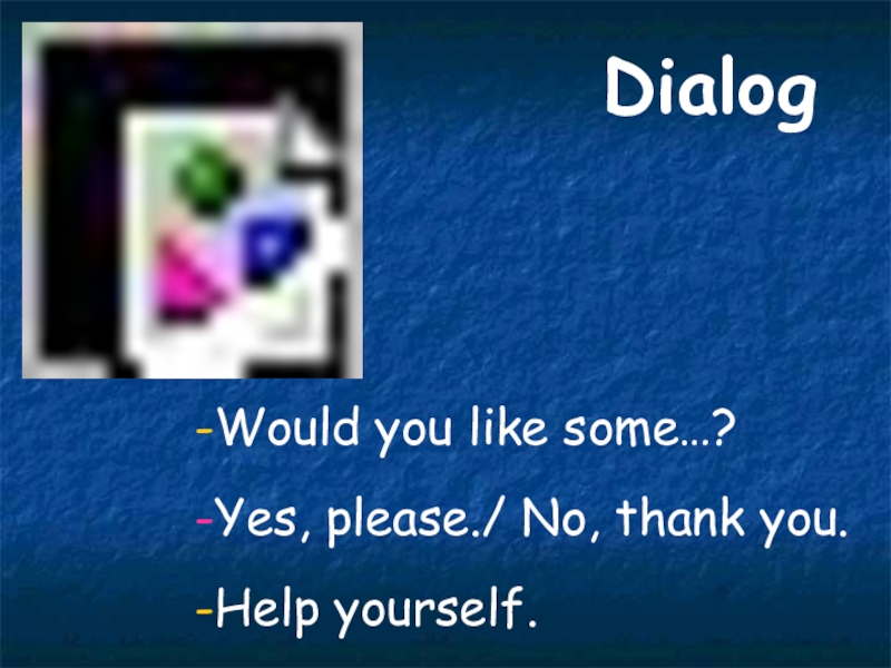 Dialog-Would you like some…?-Yes, please./ No, thank you.-Help yourself.