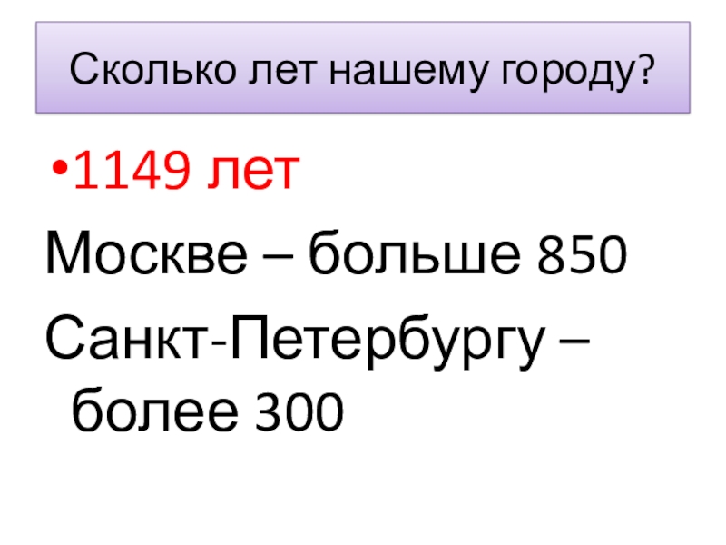 Сколько лет нашему городу?1149 летМоскве – больше 850Санкт-Петербургу – более 300