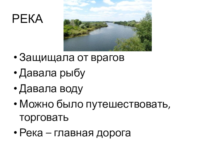 РЕКАЗащищала от враговДавала рыбуДавала водуМожно было путешествовать, торговатьРека – главная дорога