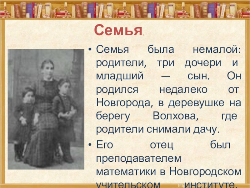 Слайд 4Семья была немалой: родители, три дочери и младший — сын. Он