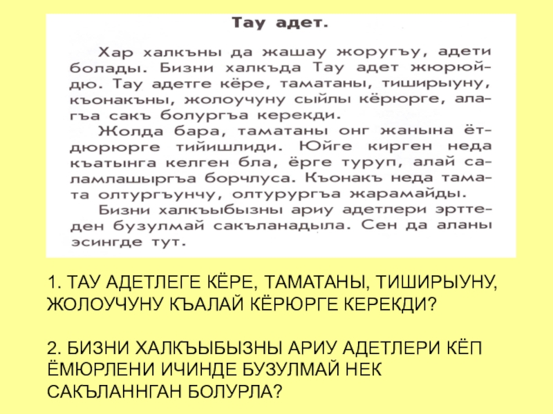 ДЕРСГЕ НИЗАМ САЛЫУ.1. ТАУ АДЕТЛЕГЕ КЁРЕ, ТАМАТАНЫ, ТИШИРЫУНУ, ЖОЛОУЧУНУ КЪАЛАЙ КЁРЮРГЕ КЕРЕКДИ?  2. БИЗНИ ХАЛКЪЫБЫЗНЫ АРИУ