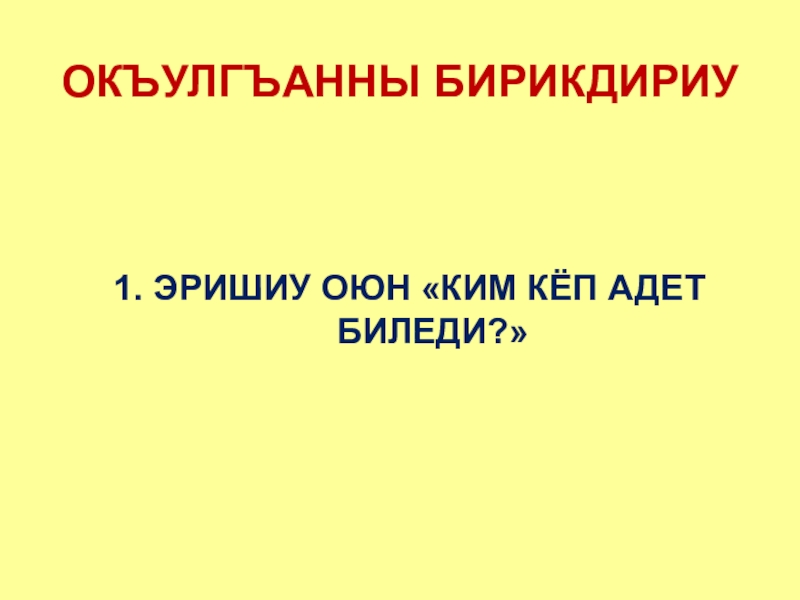 ОКЪУЛГЪАННЫ БИРИКДИРИУ   1. ЭРИШИУ ОЮН «КИМ КЁП АДЕТ БИЛЕДИ?»