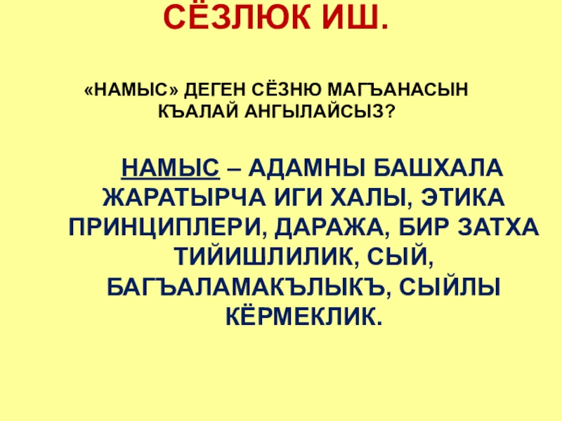 СЁЗЛЮК ИШ.  «НАМЫС» ДЕГЕН СЁЗНЮ МАГЪАНАСЫН КЪАЛАЙ АНГЫЛАЙСЫЗ?    НАМЫС – АДАМНЫ БАШХАЛА ЖАРАТЫРЧА