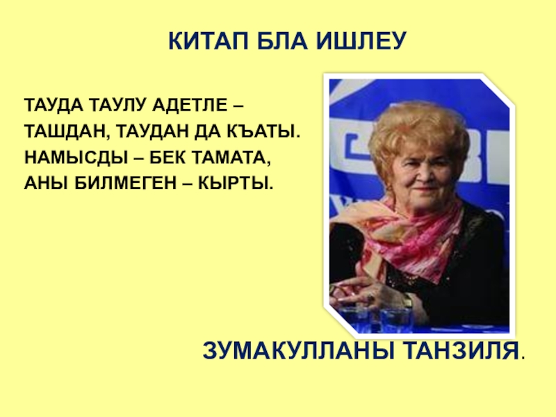 КИТАП БЛА ИШЛЕУТАУДА ТАУЛУ АДЕТЛЕ – ТАШДАН, ТАУДАН ДА КЪАТЫ.НАМЫСДЫ – БЕК ТАМАТА,АНЫ БИЛМЕГЕН – КЫРТЫ.