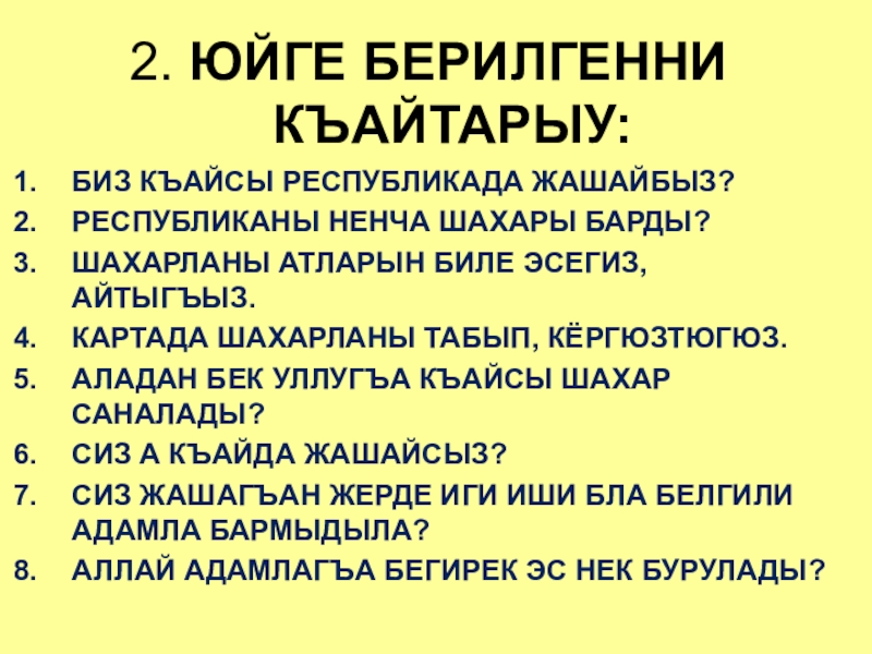 2. ЮЙГЕ БЕРИЛГЕННИ КЪАЙТАРЫУ: БИЗ КЪАЙСЫ РЕСПУБЛИКАДА ЖАШАЙБЫЗ?РЕСПУБЛИКАНЫ НЕНЧА ШАХАРЫ БАРДЫ?ШАХАРЛАНЫ АТЛАРЫН БИЛЕ ЭСЕГИЗ, АЙТЫГЪЫЗ.КАРТАДА ШАХАРЛАНЫ ТАБЫП,
