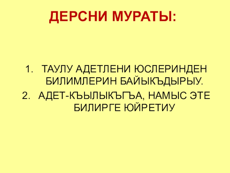ДЕРСНИ МУРАТЫ: ТАУЛУ АДЕТЛЕНИ ЮСЛЕРИНДЕН БИЛИМЛЕРИН БАЙЫКЪДЫРЫУ.АДЕТ-КЪЫЛЫКЪГЪА, НАМЫС ЭТЕ БИЛИРГЕ ЮЙРЕТИУ