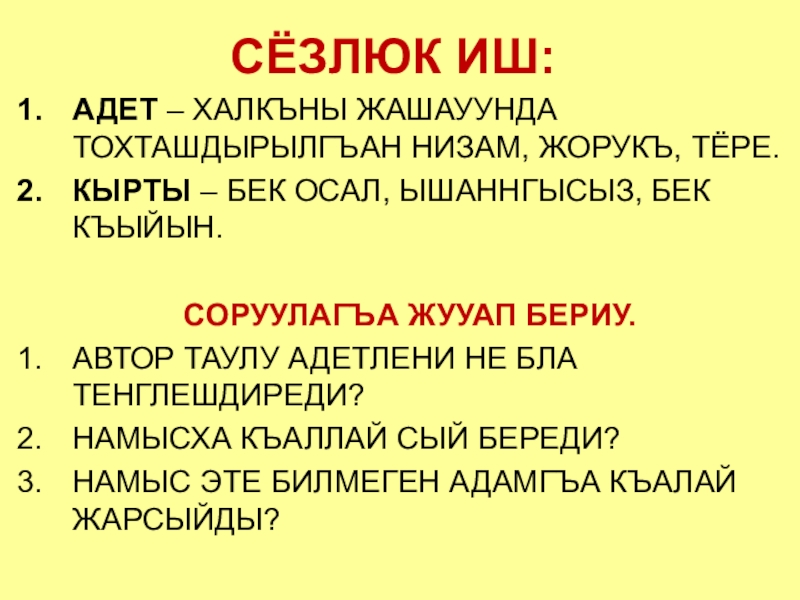 СЁЗЛЮК ИШ: АДЕТ – ХАЛКЪНЫ ЖАШАУУНДА ТОХТАШДЫРЫЛГЪАН НИЗАМ, ЖОРУКЪ, ТЁРЕ.КЫРТЫ – БЕК ОСАЛ, ЫШАННГЫСЫЗ, БЕК КЪЫЙЫН.СОРУУЛАГЪА ЖУУАП