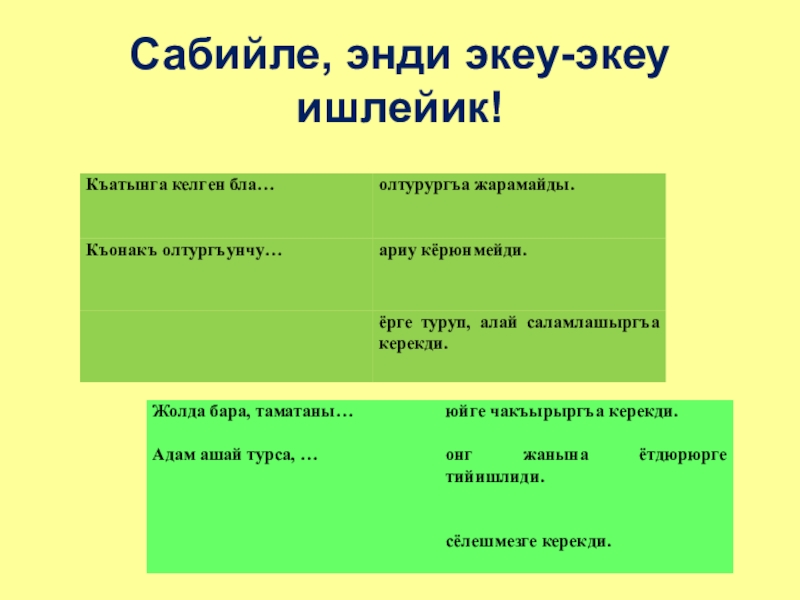 Слайд 14Сабийле, энди экеу-экеу ишлейик!