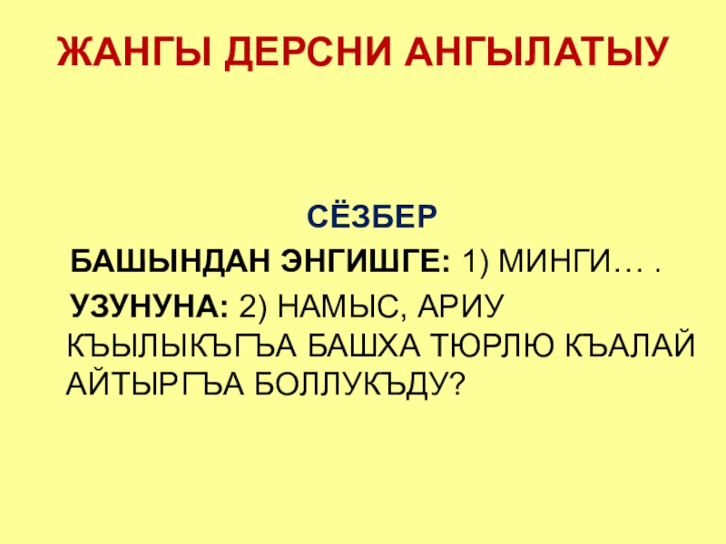 ЖАНГЫ ДЕРСНИ АНГЫЛАТЫУСЁЗБЕР   БАШЫНДАН ЭНГИШГЕ: 1) МИНГИ… .   УЗУНУНА: 2) НАМЫС, АРИУ КЪЫЛЫКЪГЪА