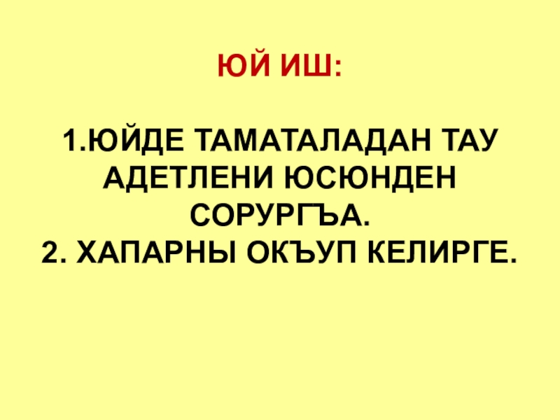 Слайд 15ЮЙ ИШ: 1.ЮЙДЕ ТАМАТАЛАДАН ТАУ АДЕТЛЕНИ ЮСЮНДЕН СОРУРГЪА. 2. ХАПАРНЫ ОКЪУП КЕЛИРГЕ.