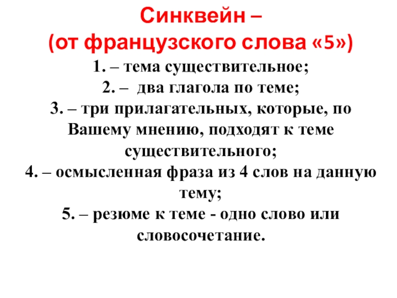Синквейн – (от французского слова «5») 1. – тема существительное;2. – два глагола по теме;3. – три