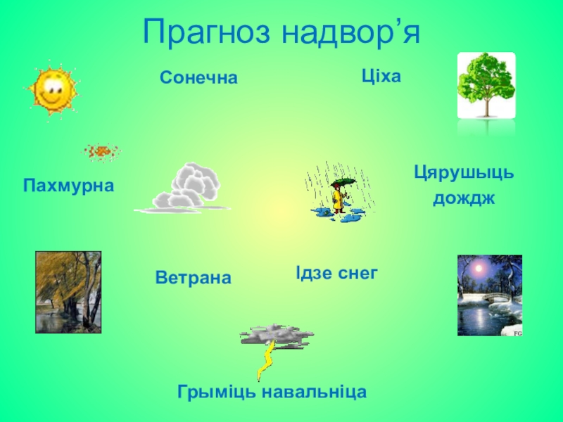 Прагноз надвор’яСонечна ПахмурнаВетранаЦіхаЦярушыць дожджІдзе снегГрыміць навальніца