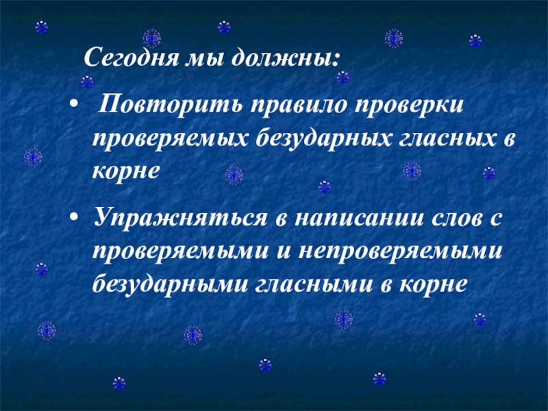 Сегодня мы должны: Повторить правило проверки проверяемых безударных гласных в корнеУпражняться в написании слов с