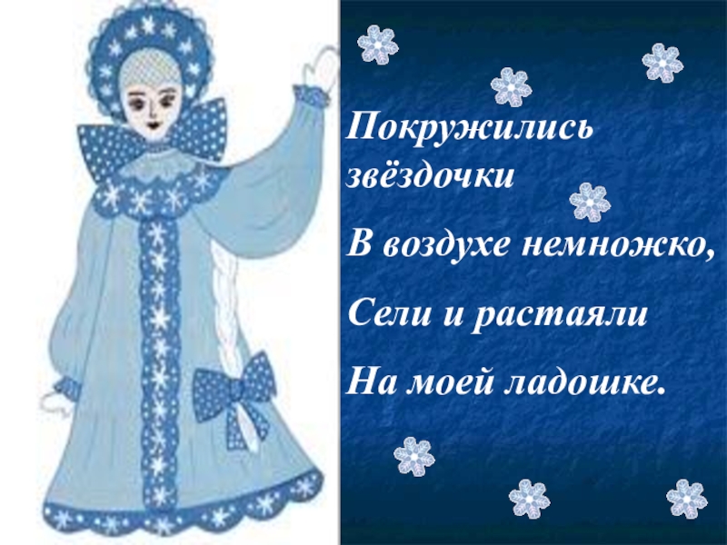 Покружились        звёздочкиВ воздухе немножко,Сели и растаялиНа моей ладошке.