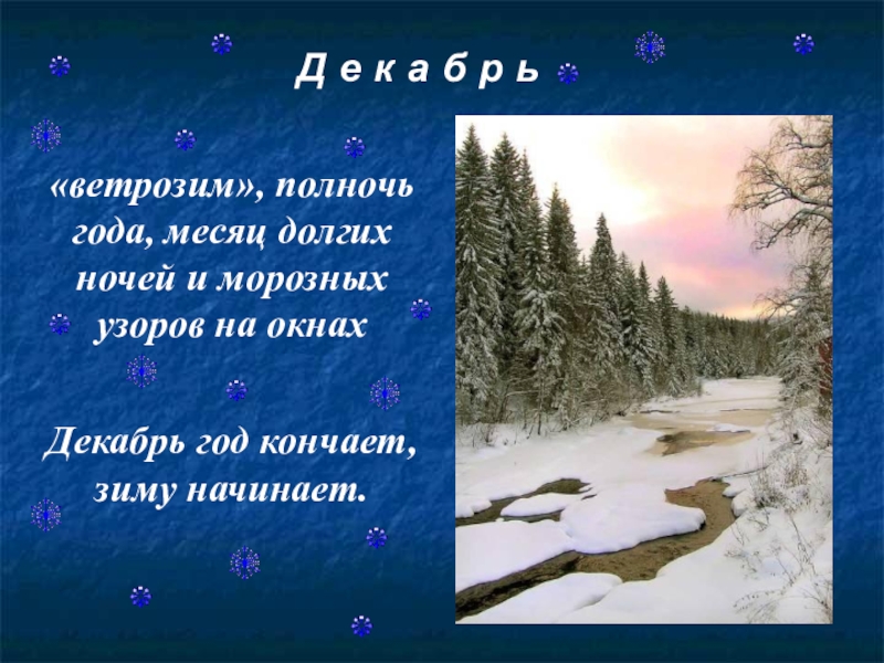 Д е к а б р ь«ветрозим», полночь года, месяц долгих ночей и морозных узоров на окнахДекабрь год кончает, зиму начинает.