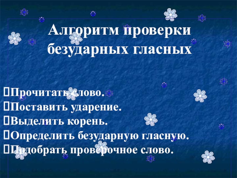 Алгоритм проверки безударных гласныхПрочитать слово. Поставить ударение. Выделить корень. Определить безударную гласную. Подобрать проверочное слово.