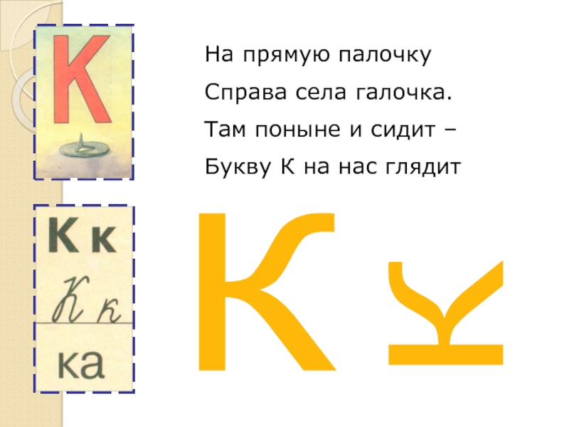 На прямую палочкуСправа села галочка.Там поныне и сидит – Букву К на нас глядитКК