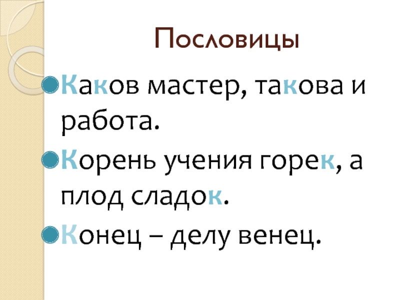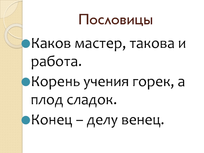 ПословицыКаков мастер, такова и работа.Корень учения горек, а плод сладок.Конец – делу венец.