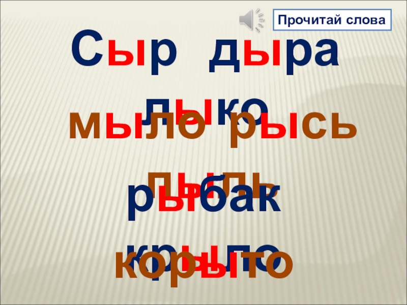 Сыр  дыра  лыкомыло рысь пыльрыбак  крылокорыто  крышаПрочитай слова