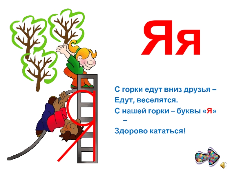 ЯяС горки едут вниз друзья – Едут, веселятся.С нашей горки – буквы «Я» – Здорово кататься!