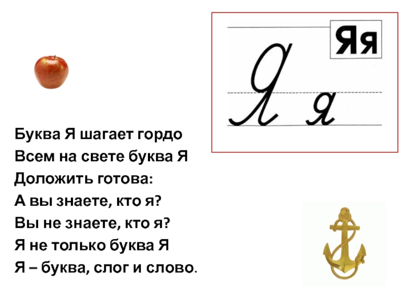 Буква Я шагает гордоВсем на свете буква ЯДоложить готова:А вы знаете, кто я?Вы не знаете, кто я?Я
