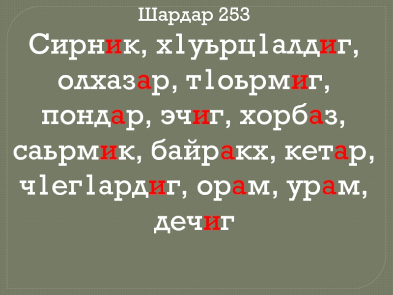 Шардар 253Сирник, х1уьрц1алдиг, олхазар, т1оьрмиг, пондар, эчиг, хорбаз, саьрмик, байракх, кетар, ч1ег1ардиг, орам, урам, дечиг