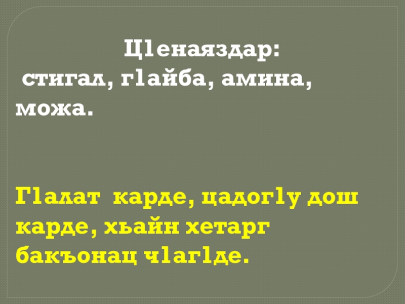 Ц1енаяздар: стигал, г1айба, амина, можа.Г1алат карде, цадог1у дош карде, хьайн хетарг бакъонац ч1аг1де.