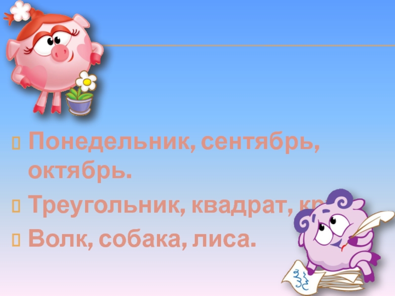 Понедельник, сентябрь, октябрь.Треугольник, квадрат, круг.Волк, собака, лиса.